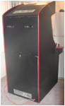 The back side showing the upper and lower doors, and the handles for moving. The upper door is screwed in place, while the lower door is opened with a key. The silver panels on top and bottom are where the fans are mounted. |