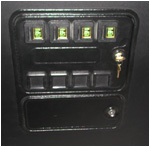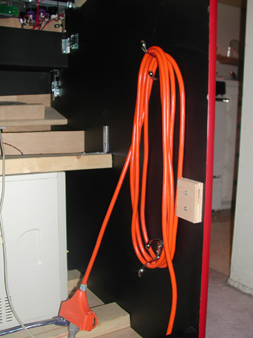 The coin door opened up, showing the access to the power switches. The power strip switch turns most of the machine on and off (the monitor, marquee, lights and fans), while the white button powers the computer on and off (I wanted the ability to leave the computer on while the rest of the machine was off. |