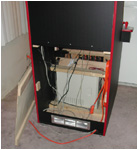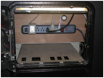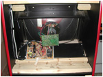 The lower door opened to reveal access to the computer. To remove the control panel, this door is removed, and the panel clamps are released from behind. |