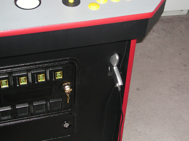 The coin door. As of this writing, the coin door is not wired up to the emulators, so it is decorative only. The rejecters do light up. Rather than use the 14V bulbs that came with the door, I simply mounted a small fluorescent bulb just above and behind the door. |