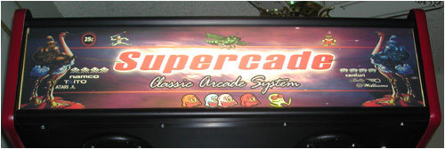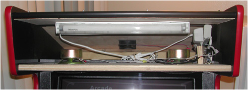 To print the marquee, I converted my photoshop file to a CMYK .TIFF file, and took it down to my local Kinkos and had them print it up on Mylar (a transparent plastic used for backlit signs). It cost around $35. The mylar was then sandwiched between two thin sheets of plexiglass. The marquee is held in place by marquee retainers from Happ Controls. The nice thing about the retainers is that they can be used to mount the marquee at any angle.